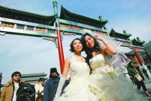 情人節(jié)的中午,兩對(duì)盛裝的同性戀情侶在前門(mén)步行街拍攝婚紗照,并和其他同性戀朋友一起向路人贈(zèng)送玫瑰。參與的同性戀情侶稱,希望通過(guò)公開(kāi)拍攝同性結(jié)婚照的形式,推動(dòng)社會(huì)對(duì)同性戀群體的關(guān)注和接納。