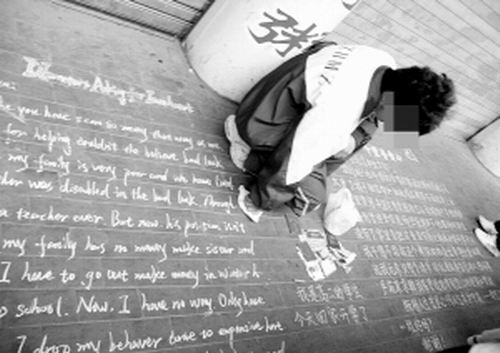 男孩的面前擺放著幾本“證件”和幾張零散的紙幣,在證件的前邊用藍(lán)色的粉筆寫著:“我是高二的學(xué)生,今天回家開學(xué)了!痹诘匕迳,他還用中文和英文兩種語(yǔ)言寫了“千里尋愛心”的求助信。