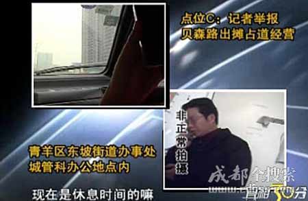 近日,成都電視臺(tái)《真相30分》欄目組接到神秘舉報(bào)電話(huà)。對(duì)方舉報(bào)城管收取好處費(fèi),對(duì)出攤占道視而不見(jiàn)。對(duì)此,記者專(zhuān)門(mén)進(jìn)行了暗訪(fǎng)。成都全搜索網(wǎng)站記者通過(guò)影像資料發(fā)現(xiàn),城管執(zhí)法人員不僅有對(duì)出攤占道經(jīng)營(yíng)故意睜一只眼閉一只眼的嫌疑,還暴露了城管管理缺失的問(wèn)題。