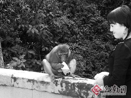 當時,兩只猴子正一前一后站在公路旁的擋墻上,一邊來回走動啃食游客“進貢”的食品,一邊不斷發(fā)出“;!钡暮鸾新,仿佛是在對圍觀的游人說:“快進貢些好吃的來,不然休想打此經(jīng)過!倍慌砸延袛(shù)輛路經(jīng)此地的車?吭诼愤叄10余名游客正興致勃勃地圍著兩只猴子觀看,幾名膽大的游客正在接受猴子的命令,乖乖地向猴子奉上隨車攜帶的食品,以供他們享用。
