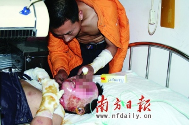 還來不及驚叫,母子倆周身便被大火包圍。離開不到半小時的父親想不到,家中一切已付之一炬。他當(dāng)然來不及多想,立即將衣服正在燃燒的妻子抱到水池邊,接過水直接潑向妻子,之后是9歲的小中林。消防車和救護(hù)車很快到來,火勢得到控制,而這一家三口也被送到武警醫(yī)院。