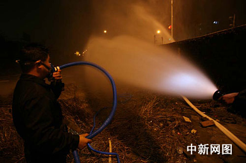 晚上七時許,記者趕到事故現(xiàn)場,空氣中彌漫著難聞的煤氣味。為防止意外,泄漏點江北大道前后500米已被交警部門拉起長長的警戒帶。由于封道,警戒線外汽車排起了長龍,一眼看不到底,圍觀者眾多,整條環(huán)城北路幾乎癱瘓,十幾名交警正在現(xiàn)場指揮疏散。而在警戒帶內(nèi)200米,消防部門正在下風方向設(shè)置了三道水幕水帶,對泄漏的煤氣進行稀釋。