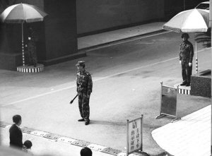 21日晚,“3·19”搶槍案件發(fā)生地某駐渝部隊(duì)門(mén)崗,原本只有兩名哨兵站崗值勤的部隊(duì)大門(mén)前,值勤人數(shù)已經(jīng)增加到了5人。門(mén)崗前的馬路上,依舊人來(lái)人往,幾個(gè)擺賣(mài)燒烤和水果的攤檔前,不時(shí)有顧客光臨。