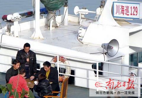 3月25日,記者在四川新聞網(wǎng)麻辣社區(qū)里看到,有關(guān)南充市地方海事局工作人員上班時間在海事船上打牌的圖片格外引人注目。網(wǎng)友稱其為“嘉陵江上最‘!未。記者在網(wǎng)上看到,一艘標(biāo)有“中國海事”字樣的船,停泊嘉陵江三橋附近,緊挨此船停泊的是一艘“川海巡129”執(zhí)法船。