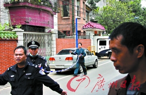 昨日中午,記者趕到現(xiàn)場,高為5層的33號(hào)大門緊閉,院內(nèi)站滿民警,門前排了11輛警車。記者觀察發(fā)現(xiàn),距離33號(hào)不到100米就是廣州最為繁華的地帶之一——五羊新城內(nèi)的達(dá)道路,路上車輛穿梭往來,周邊分布著廣州各大單位。距離33號(hào)大院的路對(duì)面,成排的老別墅被重新裝修一新,里面駐扎著數(shù)間公司,營業(yè)范圍有廣告、律師等行業(yè),白天人流不少。
