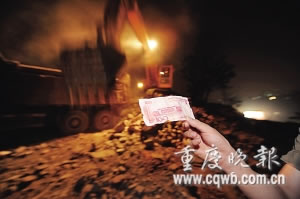 昨日傍晚,沙坪壩區(qū)雙碑光榮坡一拆遷工地上,挖掘機挖出一堆錢。正在現(xiàn)場的拾荒者和附近群眾,一擁而上爭搶這些錢財。當(dāng)晚,該房原主人蔡先生獲知消息后趕到現(xiàn)場,只撿到幾片被撕碎的人民幣碎片。蔡表示,自己遺忘在房內(nèi)的錢至少有四五萬元。