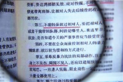 據(jù)悉,2006年,海淀城管分隊(duì)副隊(duì)長李志強(qiáng)執(zhí)法時(shí)被小販崔英杰刺死后,北京城管對隊(duì)員進(jìn)行了如何防止暴力抗法的培訓(xùn)。在一次針對科級以上(含副科級)人員的培訓(xùn)班上,曾使用過這本教材。但很快有城管隊(duì)員發(fā)現(xiàn)教材的用詞有問題,并對此提出了質(zhì)疑。此后,這本教材就再未使用過。