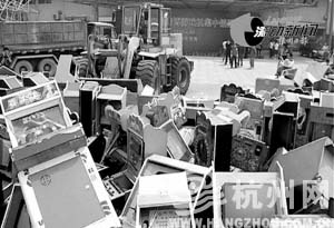 昨天上午,黃龍?bào)w育中心的西門(mén)口,3000多臺(tái)賭博游戲機(jī)堆積在此,很快,這些賭博機(jī)被鏟車(chē)砸得支離破碎,送上了垃圾車(chē)。