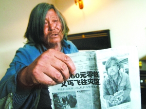 依舊是那身滿是補丁的藍布衣、依舊是那頭凌亂的花白發(fā)、依舊是那張樸實而蒼老的臉,住在北京海淀區(qū)某招待所里的徐超還是一年前的模樣,只是頭發(fā)很久沒理,已經(jīng)齊肩。徐超所有的行李不過是一個癟癟的深藍色布袋,里面除了一捧前幾日討來的鋼镚,就只有一沓用塑料袋精心包裹著的報紙。