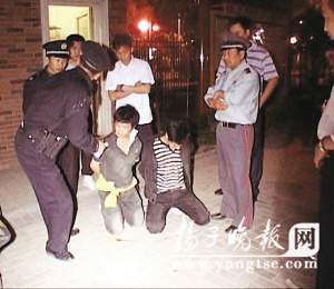 記者趕到現(xiàn)場(chǎng)時(shí),兩名年輕男子雙手被反綁,跪在小區(qū)門口不敢動(dòng)彈,他們的臉上有多處傷痕。兩名男子四周站滿了小區(qū)業(yè)主,面對(duì)大家的指責(zé),他們低下了頭,不斷求饒,讓大家放他們一馬。據(jù)一名小區(qū)保安介紹,當(dāng)晚,他和另外一名保安在門衛(wèi)室值勤。到了9點(diǎn)半時(shí),他發(fā)現(xiàn)兩名陌生男子推著一輛自行車從小區(qū)內(nèi)走來,兩人還邊走邊四處張望。他覺得對(duì)方可疑,當(dāng)即喊上一名同事上去盤問。經(jīng)盤問,兩名男子并不是小區(qū)業(yè)主,也無法說出來小區(qū)的目的,對(duì)于自行車的來歷,更是支支吾吾。細(xì)心的保安發(fā)現(xiàn)自行車鎖有明顯被撬痕跡,當(dāng)即斷定兩人是偷車賊,于是,當(dāng)場(chǎng)將這兩人按倒,同時(shí)呼叫其他保安增援。小區(qū)業(yè)主孫先生說,兩名偷車男子被揪住后不一會(huì)兒,就哭著求饒了,并主動(dòng)承認(rèn)他們是來小區(qū)偷自行車的,也表示將自行車歸還,希望保安放他們一馬。兩保安見那兩男子服軟了,才停手,但他們沒有立即報(bào)警,而是找來繩子將兩名男子雙手反綁在背后,然后脫去他們的鞋子,逼迫他們跪在門衛(wèi)室門口。