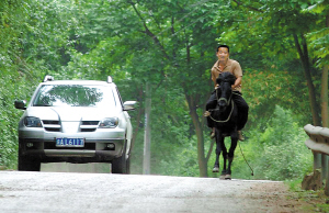 在天坪村公路上,記者找來一輛三菱車,想與“大黑”比試跑1公里!按蠛凇眳s犯倔了,怎么也不讓主人上馬。張興福便貼在它耳邊悄悄地說“你是好兄弟”、“你跑好了,給你草料吃”等好話,它才不情不愿地聽了話。