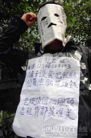一男子昨日在成都街頭以100元每天的價格出租背部,號稱“資深策劃人”的王江同時出現(xiàn),但他否認是其杰作