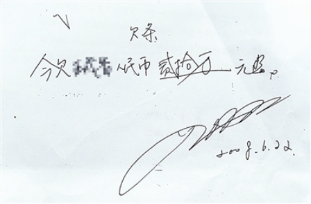 拿到錢(qián)后,雅暉寫(xiě)了張欠條:“今欠老婆人民幣二十萬(wàn)。”楚楚開(kāi)始沒(méi)有細(xì)看,隔了兩天,又覺(jué)得不妥,找了個(gè)合適的機(jī)會(huì)提醒了雅暉一下,“他把老婆改成了我的名字,但是簽名是用的藝術(shù)簽名,一共有8條弧線,我實(shí)在沒(méi)認(rèn)出來(lái),不過(guò)我想以后都快是夫妻了,還計(jì)較這些干什么呢?”
