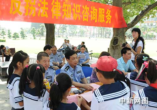 在北部灣廣場,北海市公安局?jǐn)[設(shè)的“反拐”法律知識咨詢服務(wù)臺前,一群小朋友把桌子團團圍住,就有關(guān)防拐知識認(rèn)真的向民警咨詢起來。小朋友的問題貼近實際,民警的回答則詳細(xì)易懂。通過交流,民警將一些易于操作、實際效果明顯的反拐知識教授給小朋友們。