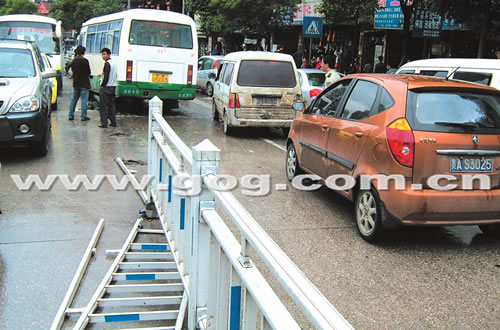 在斑馬線上的行人 被撞飛的隔離欄砸傷