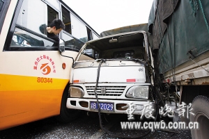 昨下午1點半,記者在事發(fā)地雙碑石井坡車站紅綠燈處看到,一輛長安小貨車卡在805路公交車和另一輛貨車之間。長安小貨車車體嚴重變形,擋風玻璃全部被撞爛,碎玻璃撒了一地。公交車和另一輛貨車,車身上都有重重的擦損痕跡。