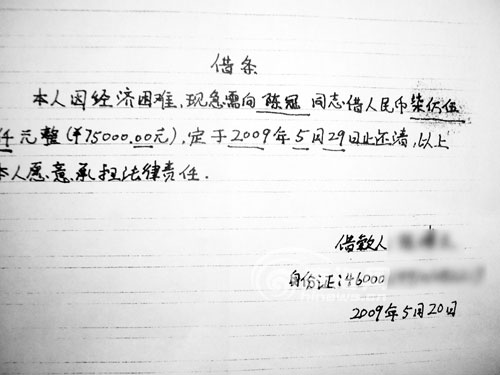 一會(huì),小鋒看到阿東將他的朋友阿冠從另一個(gè)包廂里請(qǐng)進(jìn)來。“小兄弟,我可以借給你3.5萬元,但10天后你要還給我7.5萬!卑⒐谂牧伺男′h的肩膀,小鋒左右為難,想拒絕,但是又害怕對(duì)方不讓自己離開。 “好,我同意!眲e無選擇的小鋒咬了咬牙,他按照對(duì)方所念的話寫下了借條。為取信于小鋒,阿冠還當(dāng)面將3.5萬元付給阿東。