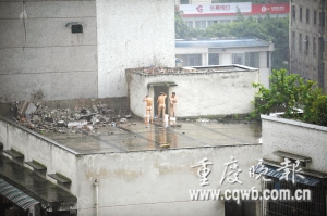 昨日下午5點30分,大渡口區(qū)文體路順祥壹街區(qū)A2棟16樓,28歲的劉莉正在自家廚房做飯。她不經(jīng)意地往窗外一望,只見約兩百米開外的一棟破舊樓房頂上,幾條白花花的身體映入眼簾——幾個成年男子脫掉衣褲,腳邊放著水桶,竟然又在屋頂洗澡!
