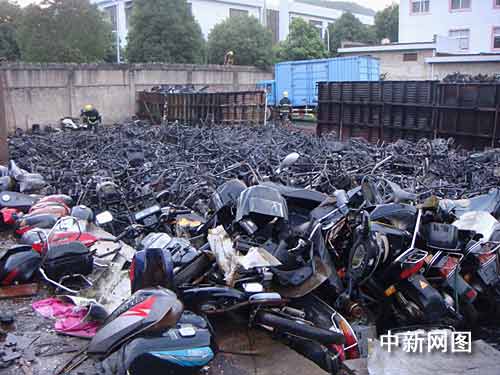 中新網(wǎng)寧波7月8日電(何蔣勇 歐陽峰)7日下午5時(shí)50分許,位于浙江省寧?h興寧中路45號(hào)的寧海縣物資再生利用有限公司發(fā)生一起火災(zāi),濃煙沖天達(dá)百余米高,整個(gè)寧?h城都能清楚地看到黑煙滾滾。當(dāng)?shù)叵啦块T先后出動(dòng)四輛消防車、近四十余名官兵參與火災(zāi)撲救,約40分鐘后成功將大火撲滅,但是該公司露天堆場內(nèi)近百輛廢舊摩托車被大火燒成骨架。