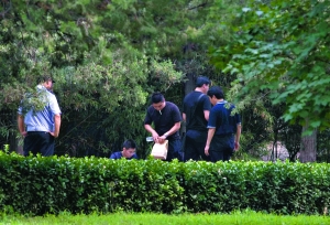 王明說,起初,藍(lán)衣男子出門后向東逃跑,跨進(jìn)了銀行旁的綠化帶,然后向南前行了幾步,隨即馬上轉(zhuǎn)身,沿反方向跑去。到達(dá)銀行對面的綠化帶時(shí),他和保安堵住了該男子。但藍(lán)衣男子沖著二人將瓶子里的無色液體灑出,隨后繞開他們,繼續(xù)向北跑去,很快就不見蹤影。