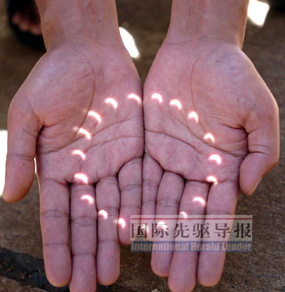 如果你沒有這些條件觀測日食,不妨學學古人。古人的土法包括:墨水觀測法,就是取一盆清水,加入墨汁,通過水面的反光觀看;小孔成像法,取兩張白紙,一張白紙上穿一個整齊的圓形小孔,將其對著太陽,另一張放在小孔后面,讓太陽光通過小孔在另一張白紙上成像;樹蔭觀測法,在日食的時候,樹蔭的縫隙就會成為天然的小孔,在樹蔭底下的小亮點都是太陽的小孔成像,你可以看到那些小亮點由圓到虧,每一個小亮點都是一個小小的日食影像,并且它有可能就在你身上!