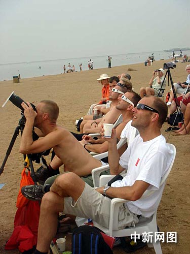 當(dāng)天早晨七點(diǎn)左右,記者來(lái)自上海市郊的金山城市沙灘。在這一被稱為本次日全食中國(guó)最佳觀測(cè)點(diǎn)之一的沙灘上已經(jīng)聚集了一千多名境外天文愛好者。據(jù)悉,此次“跨國(guó)追日”活動(dòng)是由上海、江蘇、云南三地的八家旅行社策劃組織的,成員分別來(lái)自美國(guó)、加拿大、意大利、西班牙、荷蘭、瑞典、丹麥、日本、泰國(guó)等國(guó)家。