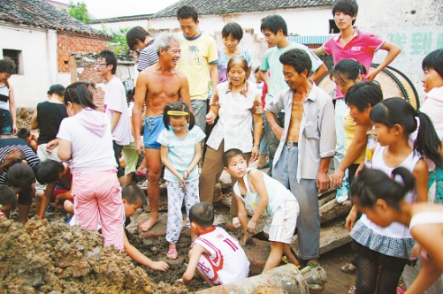 埋著銀元的泥土是來自樟三村中間的一處舊宅基地內(nèi),所以當(dāng)記者趕到那里時,發(fā)現(xiàn)約100平方米的宅基地早被200多個村民堵得嚴嚴實實,個個滿身泥污,掘地尋寶。