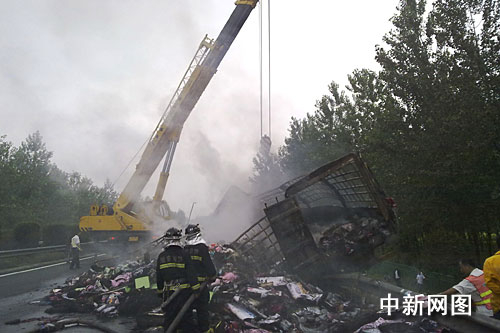 中新網(wǎng)南京七月三十一日電(衡中強(qiáng) 馬曲侃 朱曉穎)記者從淮安市消防支隊了解到,今日上午在京滬高速公路江蘇淮安市段九十三公里處一輛大貨車突發(fā)自燃,車上所載大量衣服和被套全部被焚為灰燼。由于火勢過猛,消防官兵用了兩個小時才將大火撲滅。
