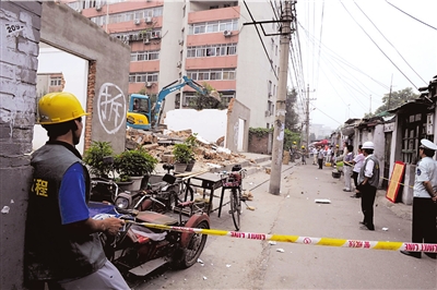 這處違法出租大院位于東木樨園11號(hào)樓和13號(hào)樓中間。昨天上午9點(diǎn)多,隨著豐臺(tái)區(qū)城管人員一聲令下,一輛小型挖掘機(jī)將吊臂揮向一堵墻面,墻面應(yīng)聲轟塌!澳憧,磚墻里都沒有水泥,只有沙土!必S臺(tái)區(qū)東鐵匠營(yíng)街道辦事處一名工作人員邊說邊指給記者看,“這樣的房子出租,安全隱患太大了!辈鸪ぷ饕齺頂(shù)十名居民觀看。聽說以后這塊地要建成健身場(chǎng)所,居民們都特別高興。一位大媽說,小區(qū)周圍沒有綠地,也沒有健身地方,居民們鍛煉一直特不方便。