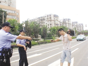 該男子出現(xiàn)之后,很快在附近人行橫道上就圍滿了群眾,大家都遠遠地站著,紛紛議論起來!安粫窃谂碾娪鞍桑恳矝]有看到攝像機?”就在周圍群眾七嘴八舌地議論著的時候,幾輛警車呼嘯而至。