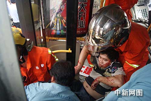 時間就是生命,救援刻不容緩,經(jīng)過現(xiàn)場勘查后,指揮員吳彬立即下達作戰(zhàn)命令展開營救。警戒小組負責現(xiàn)場警戒,同時維護好現(xiàn)場秩序,以便營救工作迅速展開;救援小組一方面負責協(xié)助現(xiàn)場民警、醫(yī)生對受傷乘客進行救助轉(zhuǎn)移,另一方面負責對那名傷勢較重的乘客實施緊急破拆救人。