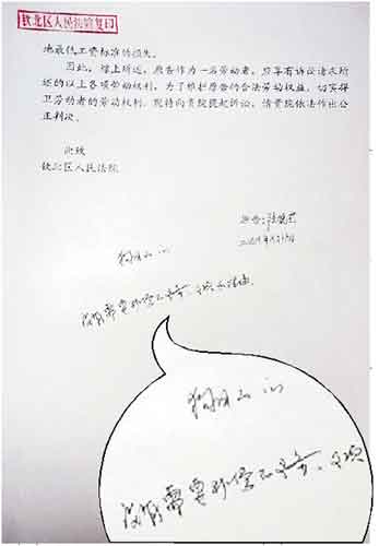 去年12月8日,李先生到法院查閱案件材料時(shí),在一份起訴狀的末頁(yè),看到有人在空白處寫(xiě)下了兩行文字。上一行寫(xiě)著“狗日的”字樣,下一行則寫(xiě)著“沒(méi)有需要補(bǔ)償?shù)牧x務(wù)、事項(xiàng)和理由”字樣(見(jiàn)左圖)。夫妻倆認(rèn)為,有人誤導(dǎo)和左右了此次判案。