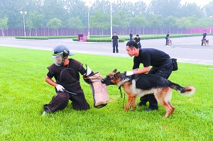 昨天,十余名首都機場分局馴犬員帶領(lǐng)著6只德國牧羊犬在首都機場專機樓廣場進行了集訓。這6只警犬是今年6月,機場公安分局張志副局長帶隊三上沈陽到公安部沈陽警犬基地精心挑選的。入選條件非常嚴格,從警犬的神經(jīng)類型敏感度到興奮度,從犬只的聽力到四肢的力量,都需要符合嚴格標準。(記者王薔)