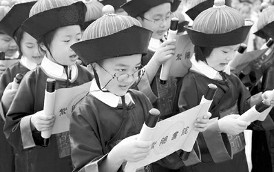 9月1日,杭州紫陽小學(xué)舉行了一場特別的新生入學(xué)儀式。小學(xué)新生穿戴著類似影視劇中的清朝衣服、帽子,手捧黃色書卷,誦讀入學(xué)三字經(jīng),向師長行禮。