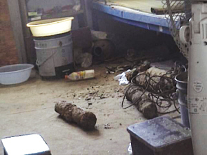 昨天中午12點左右,一個收廢舊的來到這家工地,說是收廢舊,其實是想收點文物,因為工地經常能挖出些瓶瓶罐罐的。一個民工說他有好東西,就把收廢舊的帶到了宿舍,從床下掏出個銹跡斑斑的東西,說這些陶罐能值多少錢啊?收廢舊仔細一看,哪里是什么陶罐,明明是枚炮彈,而且床下還有3枚。乖乖!敢情前天一夜我們都睡在炮彈上,同宿舍的民工都炸了。工地的安全員趕到,立刻報警。不久警察趕到,封鎖了現場,并通知了排爆大隊。這4枚炮彈長約40厘米,直徑約20厘米,這位民工說是前天夜里施工時,挖土機挖出來的,他以為是陶瓷罐,就放在了床下。警察說炮彈里是有火藥的,但因為銹得嚴重,還辨認不出是什么炮彈。這些炮彈很不穩(wěn)定,雖然很少爆炸,但遇到高溫或撞擊就難說了。下午1點鐘排爆大隊趕到,將炮彈帶走。 (吉啟雷)