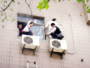 昨天下午2點(diǎn)半左右,南京白下路111號的25層高樓——洪宇商務(wù)中心3樓突然發(fā)生火災(zāi),許多市民捂著鼻子從樓內(nèi)奔跑出來,但仍有幾位市民未能及時(shí)逃脫,他們爬上窗外的空調(diào)外機(jī)求助。消防官兵趕到現(xiàn)場將他們安全救下。