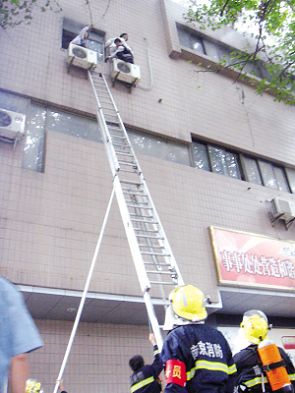 在發(fā)現(xiàn)大樓失火后,商務(wù)樓內(nèi)的物管立即報(bào)警求助。2點(diǎn)34分,消防人員、交警和120急救車趕到現(xiàn)場。在商務(wù)樓的西側(cè)兩個(gè)窗戶處,有幾位被困在樓內(nèi)的市民被濃煙嗆得站在窗口外呼救,由于煙霧太大,他們不得不爬出窗外,站在墻外的空調(diào)外機(jī)上等待救援。無法站立的這幾位市民一邊用手扶著寫字樓的外墻,兩只腳站在空調(diào)外機(jī)上,這一幕無不讓現(xiàn)場圍觀的群眾為他們捏了一把汗。等到消防隊(duì)員趕到現(xiàn)場之后,立即呼喊他們不要緊張,不要向下跳,在現(xiàn)場架設(shè)了云梯進(jìn)行救援并成功地將四名被困市民解救了下來。