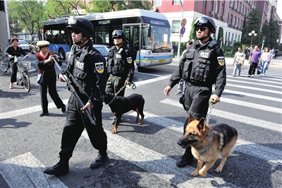 昨天上午,3名頭戴防暴頭盔,身配18.4毫米防暴槍、95式?jīng)_鋒槍和92式手槍,帶領(lǐng)兩只警犬巡邏的特警隊(duì)員現(xiàn)身臺基廠北口。昨天起,武裝特警開始帶警犬在長安街沿線、西單、王府井等重點(diǎn)地區(qū)巡邏。據(jù)悉,多個特警巡邏車組從早8點(diǎn)半到晚10點(diǎn)無縫隙地進(jìn)行巡邏,每個車組由3名特警隊(duì)員組成,參加巡邏的還包括部分女特警隊(duì)員。警方提醒市民,由于特警攜帶的大多是撲咬犬,看到警犬后千萬不要試圖撫摸、引逗警犬。(董世彪 盧國強(qiáng))