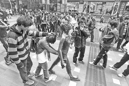 北京女孩清越去年6月28日參加了一次“定格”:大家隨意在路上走,一個(gè)信號(hào)發(fā)出來(lái),參加活動(dòng)的人就保持不動(dòng),持續(xù)3~5分鐘!拔覀兿牒椭?chē)男腥诵纬蓜?dòng)靜的對(duì)比,純粹就是好玩!眳⑴c者全從網(wǎng)上召集,活動(dòng)那天來(lái)了將近200人。