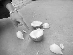 當(dāng)記者趕到現(xiàn)場(chǎng)時(shí),楊先生已被120急救車(chē)?yán)t(yī)院檢查治療。在這棟居民樓下,一個(gè)被砸成四分五裂的洋蔥,仍留在地面上,據(jù)目測(cè),這個(gè)洋蔥的直徑至少在10厘米以上,重量也差不多有500克。