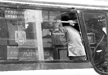 記者在楊家坪車站等來(lái)一輛362,車內(nèi)擠滿了人。一男性乘客坐在前門(mén)窗沿邊,半身露出窗外。記者打完卡擠進(jìn)車廂,后面一男子因無(wú)零錢(qián)投了5元紙幣。當(dāng)他準(zhǔn)備站在門(mén)邊等待回收另外4元錢(qián)時(shí),后面的乘客蜂擁至車廂,該男子也無(wú)奈地被擠了進(jìn)去!澳獢D、莫擠,我投了5元還沒(méi)補(bǔ)”,這時(shí)有乘客說(shuō)道,“兄弟,早上坐車恁個(gè)打擠,你以后各人準(zhǔn)備零錢(qián)嘛”。