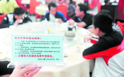 “看到桌上的提示牌都不好意思喝酒了,醉酒后還要讓工作繁忙的交警來(lái)代駕,多對(duì)不住人啊!弊蛉罩形,在位于開福區(qū)營(yíng)盤路的天福家菜館用餐的李雄昂說(shuō)。記者發(fā)現(xiàn),這里每張餐桌上都放著一張?zhí)崾九疲骸榜{駛員朋友:如您飲酒得不到家人朋友的理解不幫您代駕,那么請(qǐng)您打我的電話:13975155666。我們交警將為您提供免費(fèi)代駕服務(wù)。開福區(qū)交警大隊(duì)二中隊(duì)中隊(duì)長(zhǎng)李樂!
