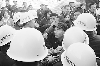 就在這時,眼看房子就要被拆掉,在一旁圍觀的3名村民顯得很激動,他們將挖掘機圍住,并將挖掘機司機拉下了車。為了防止發(fā)生意外,執(zhí)法隊員站成一道人墻阻止村民進入。但是村民并沒有罷休,而是開始破口大罵,并強行沖擊人墻,試圖進入磚塊亂飛的拆遷現(xiàn)場,現(xiàn)場情況一度很緊張。在執(zhí)法隊員的極力阻止下,村民才沒有沖入拆遷現(xiàn)場。