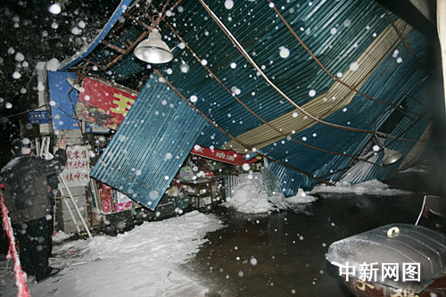 中新網石家莊11月10日電(李光)今天下午,河北省石家莊市槐中路新世隆商場附近一自由市場由于頂蓬積雪過多被壓塌。