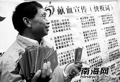 “我健康我獻血,你捐血你快樂,救人生命積功德……”在?诿髦閺V場,省血液中心采血車旁,穿著樸素的楊順德,操著四川口音、拿著半導(dǎo)體喇叭重復(fù)地向人們宣傳獻血的好處和獻血知識。