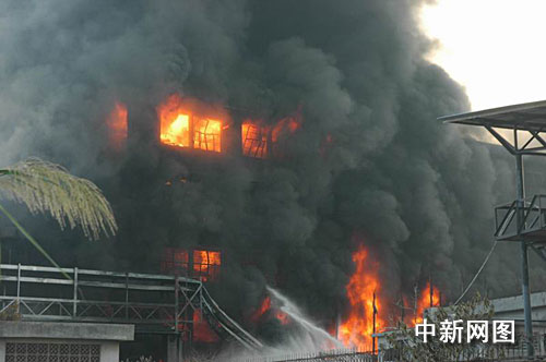 記者在現(xiàn)場(chǎng)看到火光沖天,滾滾濃煙躥起有兩百米高,方圓一公里內(nèi)可聞到陣陣焦味。離火災(zāi)現(xiàn)場(chǎng)數(shù)米之隔,則是茂名華粵勞保用品公司生產(chǎn)車間,工人正在緊急轉(zhuǎn)移物資,以防火災(zāi)蔓延。