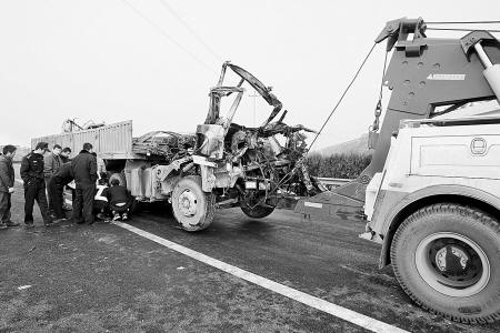 昨天下午,記者趕到西禹高速時,省公安廳交警總隊高交支隊的民警正在指揮清障車拖拉車號為陜E2679的一輛半掛貨車。這輛滿拉著鋼材的半掛貨車,駕駛室受撞擠壓成扁平狀,已被燒成黑色。如果不是右側(cè)車身伸出扭曲的車門,幾乎無法讓人判斷出這里就是車頭。省交警總隊高交支隊一大隊事故科科長楊大偉介紹,這輛車的司機和副駕駛座上的人均已當(dāng)場死亡。