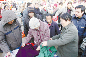 在一個小攤兒上,一位老大媽看上了一件毛衣,正在討價還價,先前的兩個老人擠了上來。老漢擠住買毛衣的老大媽,老太太左手抓起一件毛衣作掩護(hù),右手伸進(jìn)了老大媽左側(cè)的口袋,把錢掏走了。