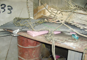 進入工地大門,記者看見了一個門衛(wèi)室,有一個圈著電纜的鐵環(huán)固定在屋檐下,工地上的工人表示,小偷被抓到后,就是被繩子捆住然后吊在這個鐵環(huán)上面的。而在門衛(wèi)室一旁還有一個狗窩,狗窩上散落著許多雜物,其中就有當初用來捆小偷的繩子。在狗窩一旁,還有一口袋扣件,這就是小偷偷竊的工地東西,工人表示,這些扣件如果拿出去賣,至少能賣百來元。對于用繩子捆住小偷又吊起來,工地上的工人并沒有否認,“是有這回事,那么多人都看到了,后來警察來了,才放下來!”一位工人告訴記者,可是當記者問是誰把小偷吊起來的時候,這名工人搖頭稱不知道。