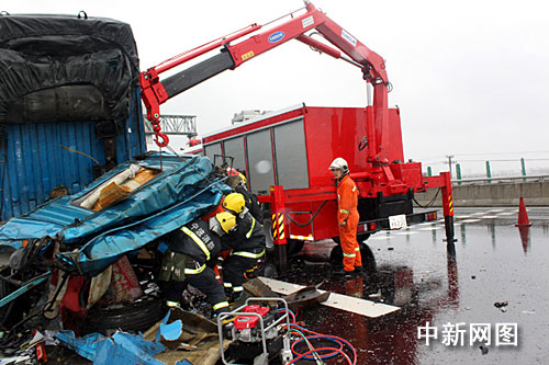 今天早上8時(shí)許,高速寧波支隊(duì)指揮中心接到報(bào)警稱在繞城高速姜山北互通附近有兩車(chē)追尾,有人受傷,且傷勢(shì)較重。接警后,四大隊(duì)巡邏民警立即趕赴現(xiàn)場(chǎng)。到達(dá)事故現(xiàn)場(chǎng)后,民警發(fā)現(xiàn)肇事的是蘇FU3033車(chē)牌號(hào)重型廂式貨車(chē)和閩A15387號(hào)重型廂式貨車(chē)。其中后車(chē)閩A15387號(hào)大貨車(chē)駕駛室已經(jīng)嚴(yán)重變形,駕駛室在碰撞后,被擠壓成厚度不足1米的“鐵餅”。透過(guò)碰撞的殘骸可以隱約看到有兩人被困車(chē)內(nèi),氣息十分微弱,F(xiàn)場(chǎng)民警在展開(kāi)施救同時(shí),立即要求增援。8時(shí)26分,鄞州消防大隊(duì)接到指令后立即出動(dòng)1輛搶險(xiǎn)救援車(chē)、7名消防官兵趕赴現(xiàn)場(chǎng)。